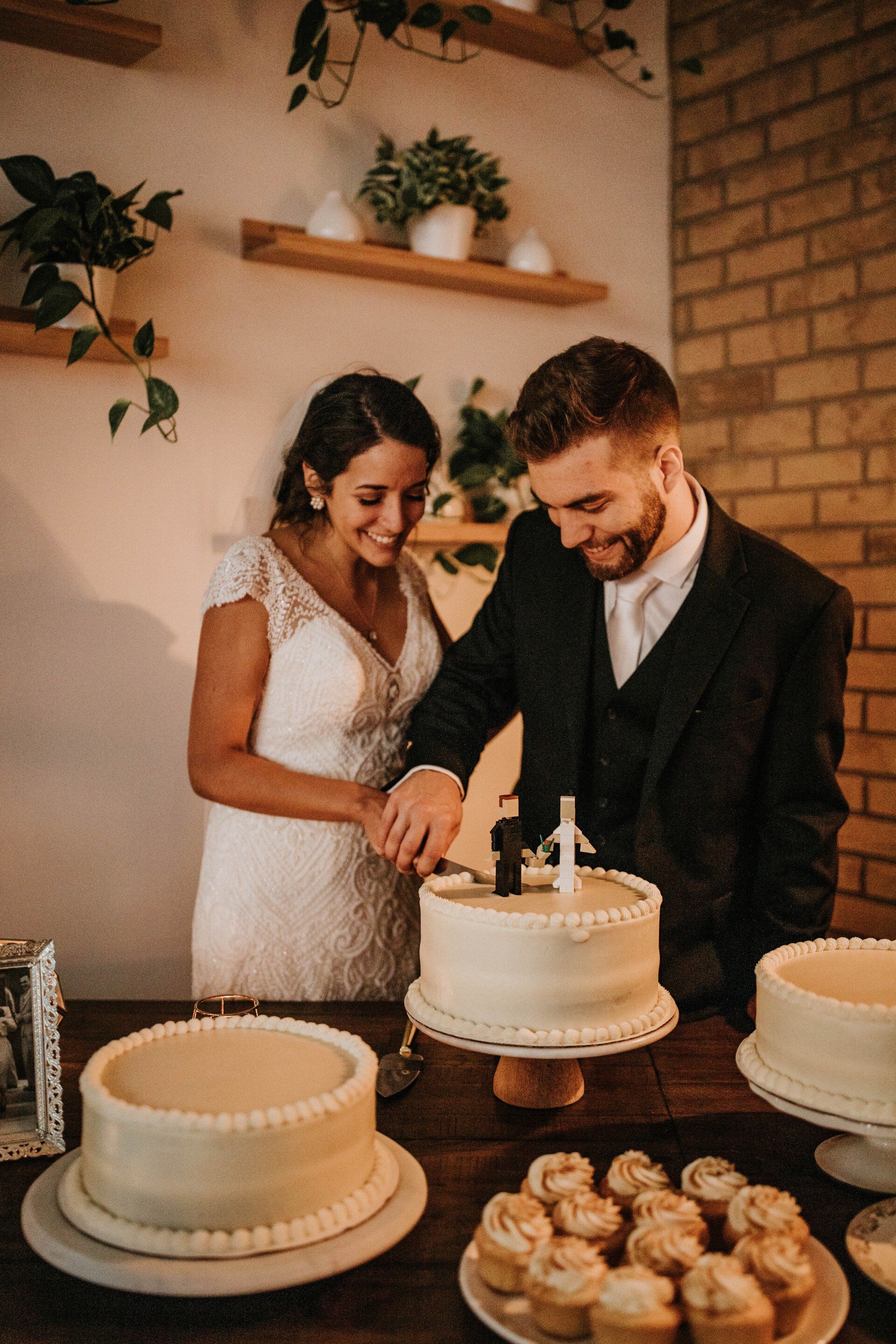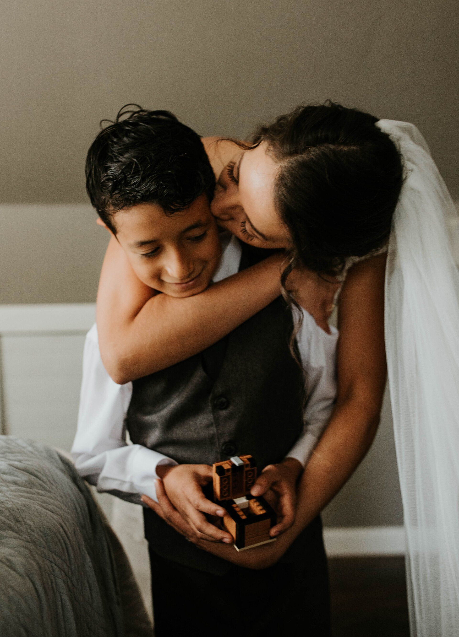 When Jasmin finally got to wear her gown on the big day, she had lots of help getting ready. Her mother and aunts had been a major part of preparing Jasmin for significant moments throughout her life such as her quinceañera and school dances. Keeping that tradition alive, they styled Jasmin’s hair and makeup on her wedding day! “My family is Mexican, so they also got me ready for my quinceañera,” she explained. “It was super important they would be there to help me get ready for my wedding too. . . My mom did my makeup, and she was super proud, and my aunts did my hair. It was a family event!” With family being so important to Jasmin and Evan, they also included contributions from Jasmin’s youngest brother, David. She had not planned to have a cake topper nor a ring box, but David had a solution to both! “A week before [the wedding], he came to me with a little ring box made of Legos. He also made our cake topper out of Legos with a bride and groom holding hands,” Jasmin recalled with a smile. “I didn’t ask him to do any of that—he just came to me with it!”