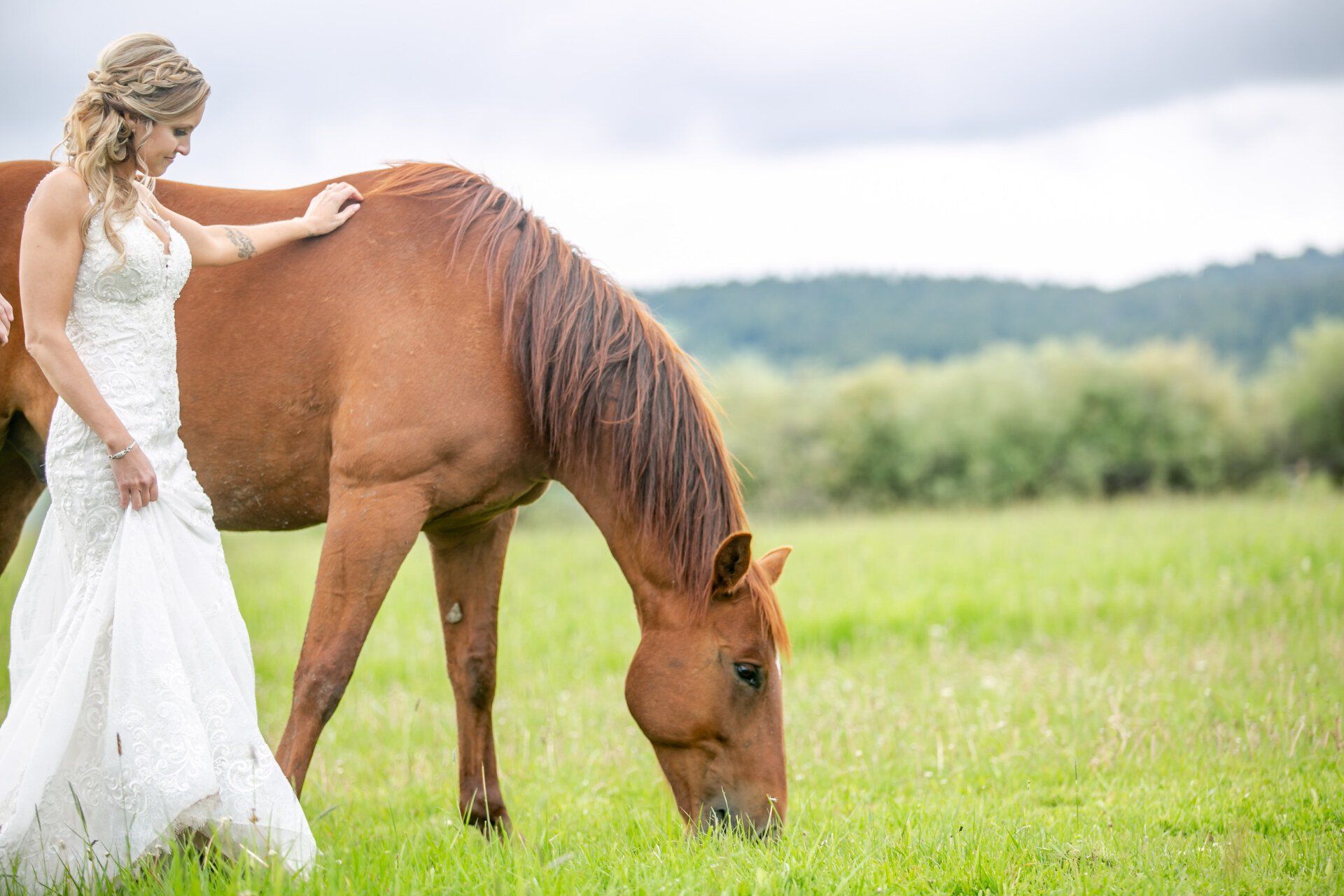 It was time for wedding planning! “I never wanted a big wedding,” Megan explained. She looked for a scenic outdoor venue and stumbled across Diamond Cross Ranch. This venue was the perfect fit for Megan and Peter because it offered beautiful mountain views and horses, which the couple enjoy riding. To help with planning an out-of-state wedding, Megan hired a wedding planner who could help coordinate vendors and pull things together on the big day.