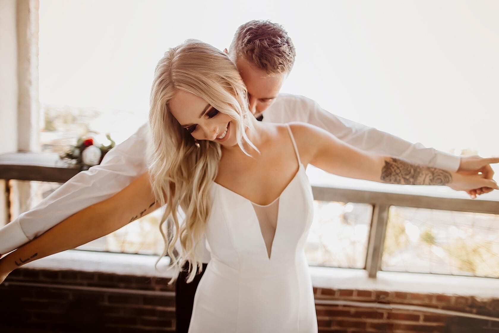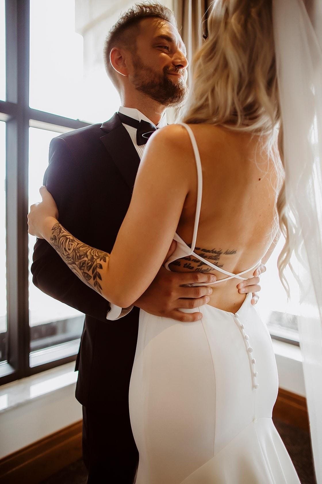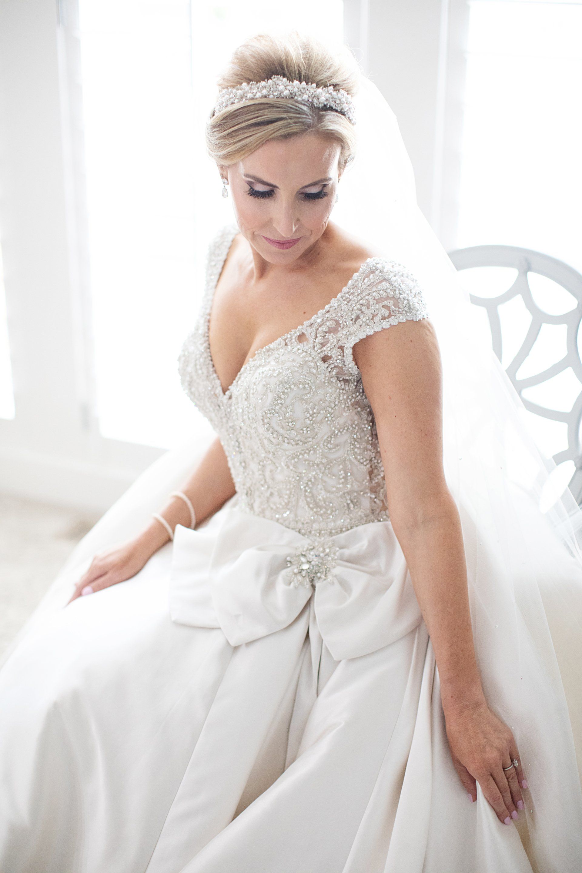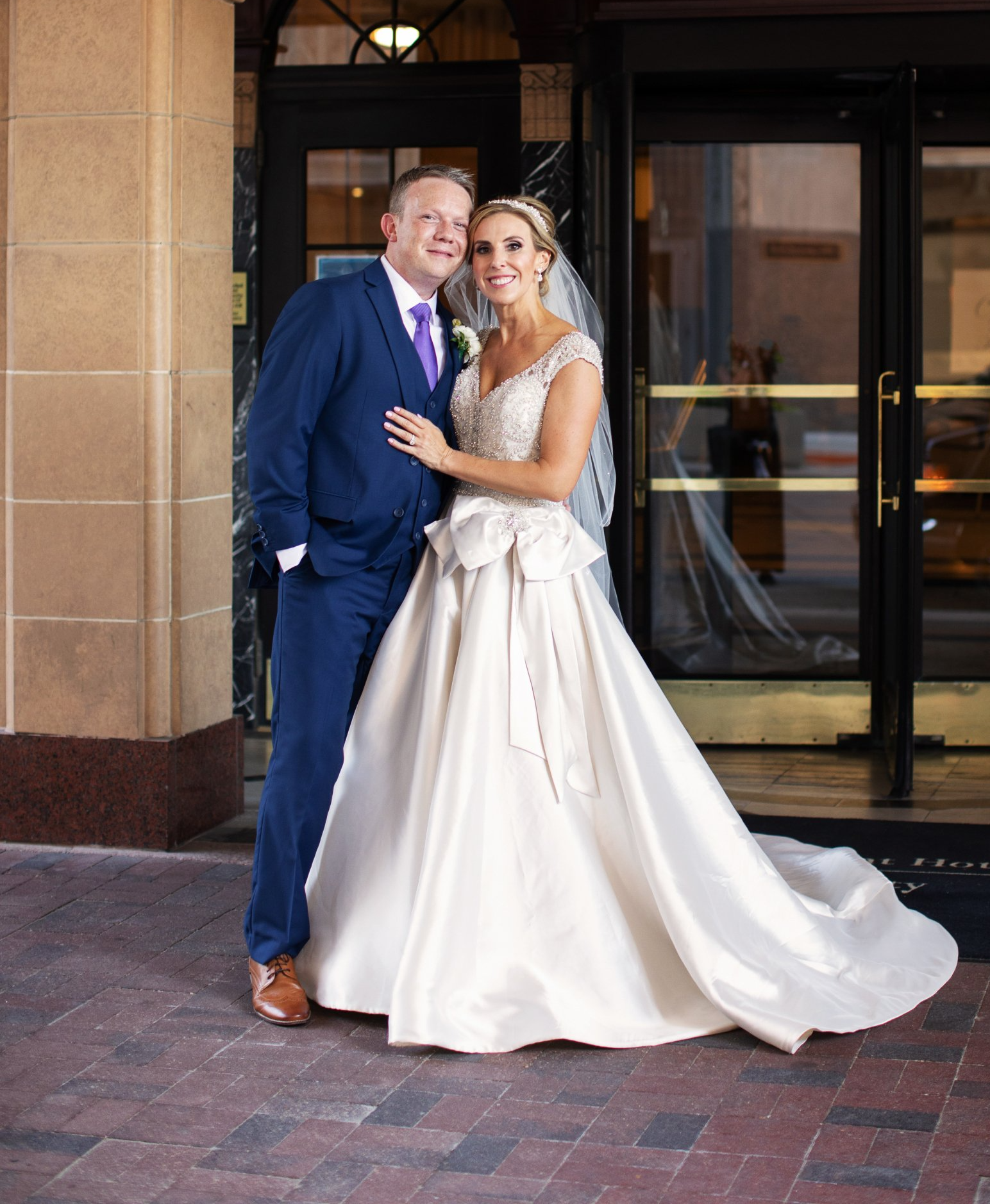 Kristi began her gown search knowing exactly what she wanted. There was only one problem: it did not exist! Kristi wanted an A-line style with beading on the bodice and a dramatic bow at the hip. This was a unique style, and Kristi ended up looking for gowns which met all of her other requirements with the knowledge she could add a bow to almost any gown either by customizing her gown through the designer or with a seamstress. Kristi said, "I had a ton of photos and knew exactly what I wanted. We tried this at multiple shops but the whole look just never came together. At Clarice's I loved the dress [by Allure], and it was just enough, but I still had my heart set on a bow. My associate, Ry, was great and knew I was looking for a bow. Luckily they had a bow from Allure. . . We pinned it onto the dress, and I was sold!" The customization process elevated style 9710 into her dream dress, and she urged other brides to explore their options for changing their gowns. "I definitely would suggest customizing your dress, especially if you know what you want and are having trouble finding it," she said. "This is the one time you can make something you truly love and looks like no other dress!"