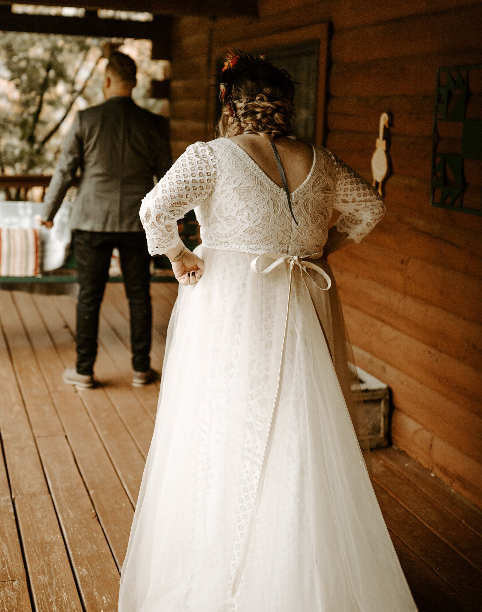 Emily loved the unique lace pattern and bodice of dress Sloane but wanted a gown which would not hug the whole body. Designer Casablanca is known for its ability to make changes to its gowns based on the customer's wishes. To make the dress unique to Emily, Casablanca loosened the the gown's skirt to a sheath fit rather than a fit-and flare style. The company also created a custom tulle overskirt which attached via the gown's pre-made belt. "There's always going to be some risk involved in getting a dress that, essentially, doesn't exist yet.," Emily said of the customization process. "[but] if you know your body and know what you want, the girls at Clarice's can most certainly make it happen. I never had a doubt that my dress would be exactly what I envisioned. Honestly, I say shoot for the stars and get a dress that is YOURS." This gown certainly is hers, with its dreamy skirt unique to Emily!