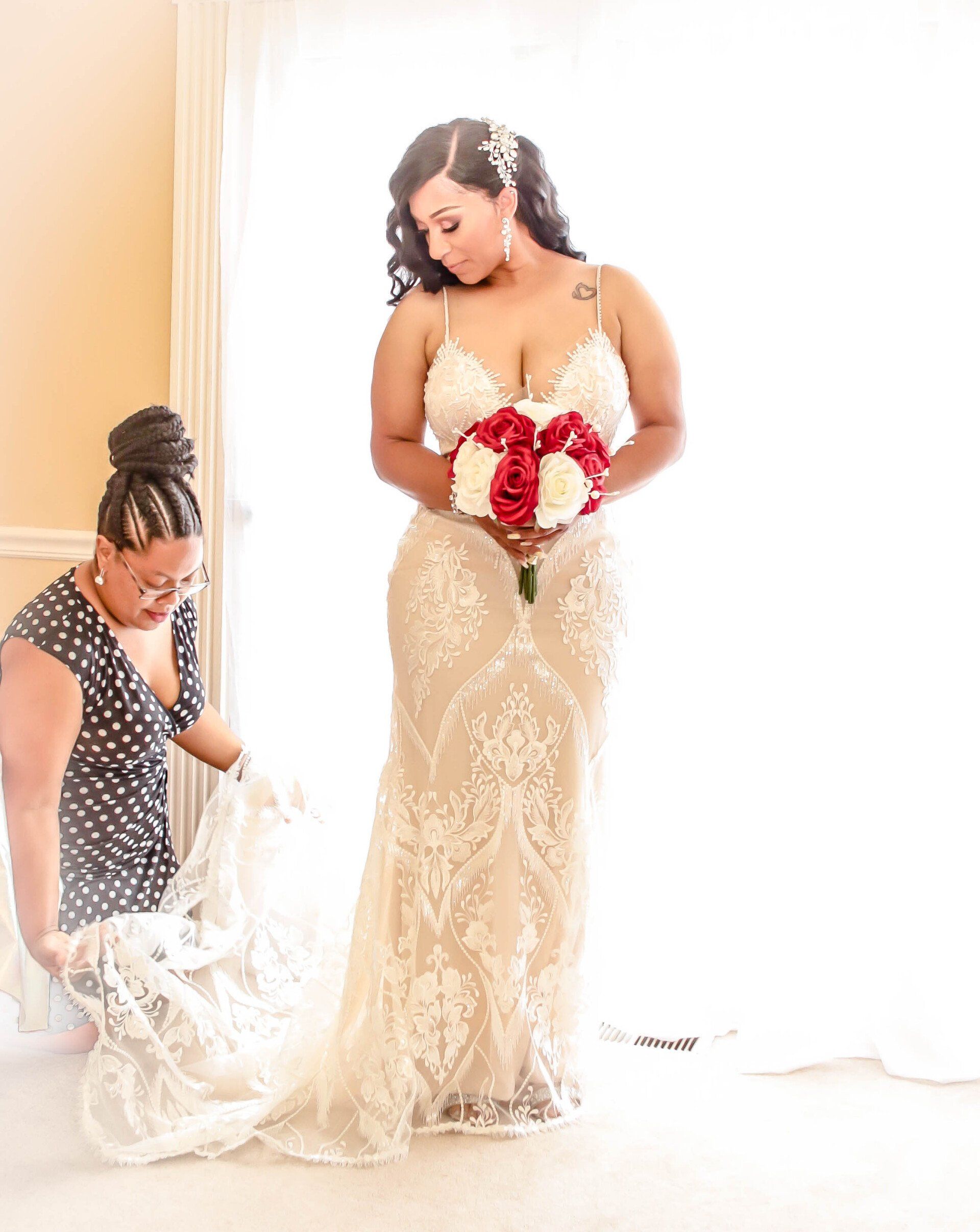 Another aspect of wedding planning that was affected by these chaotic changes was Rebecca’s wedding gown. Having come to Clarice’s looking for a gown fit for Vegas, there was some concern the dress would not fit the updated backyard theme. “The experience was definitely different because we were planning to go to Vegas, so I was thinking I need something very sparkly but not heavy. . . I had good experiences at other places, but it just felt so much more natural at Clarice’s. . . I don’t regret the dress one bit, [even with the change in venue]. Clearly, being outside [on the] 4th of July, it was hot, so I didn’t need anything too heavy.” Rebecca explained. “We are going to have a reception next year. . . and we are going to go to Vegas to take pictures, so I’ll definitely be wearing it a few more times!”